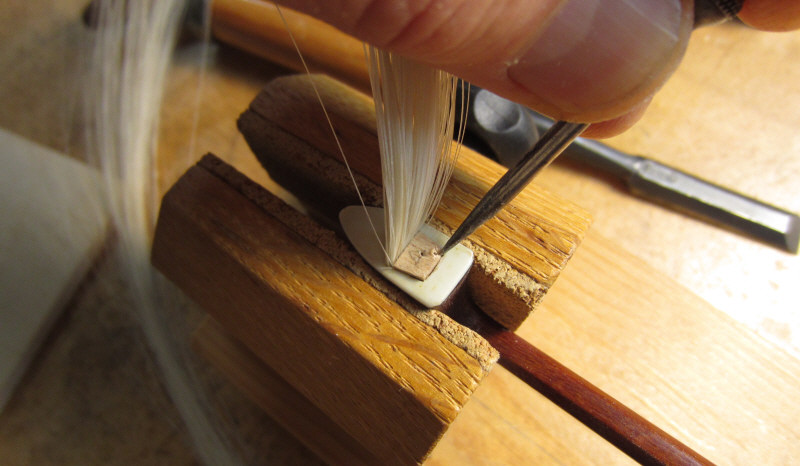Chez Alex et Arthur, je laisse mon archet un ou deux jours pour qu’on lui refasse la mèche : cela veut dire poser une nouvelle mèche de crins sur la baguette. Vous savez, ces crins de chevaux (si, si..!) sur lesquels on met la colophane (la résine comme les danseuses au bout de leurs pointes) et avec lesquels on frotte littéralement les cordes pour produire le son. Au bout d’un moment, les crins s’usent ou sont trop chargés de colophane. Pour avoir une résonance optimale, rien de tel qu’une mèche neuve.