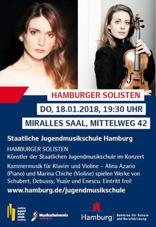 Bis bald in Hamburg ! Wir spielen am Donnerstag um 19:30 Uhr mit Alina Azario Schubert, Mozart, Ysaye, Bartok.